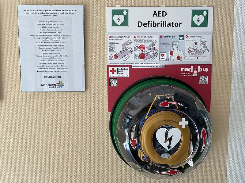Der Defibrillator ist öffentlich und hängt in einem Wandkasten gut sichtbar im Eingangsbereich des Hauses.